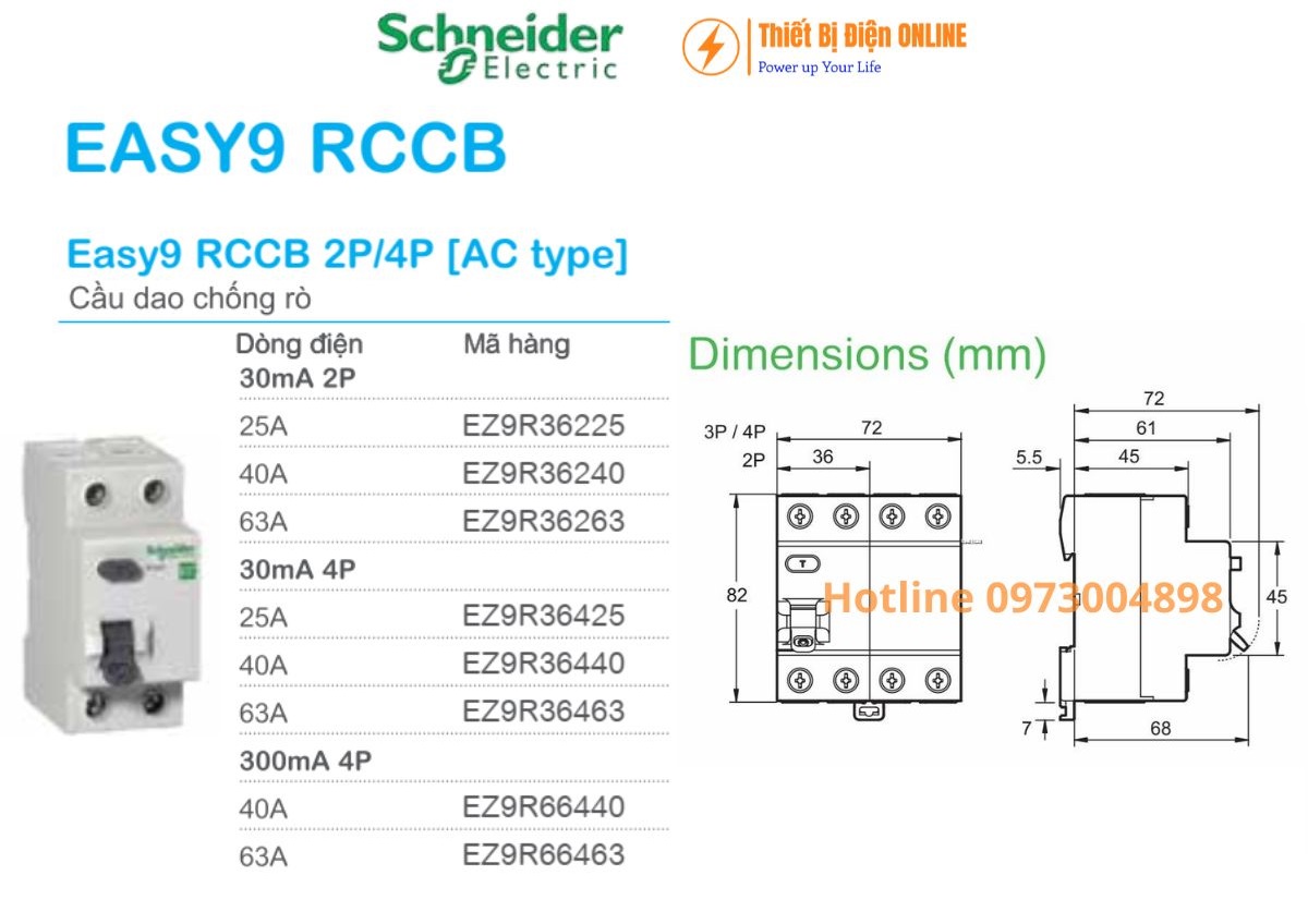 Catalogue Aptomat chống giật RCCB 4P 40A 30mA Schneider EZ9R36440 Easy9