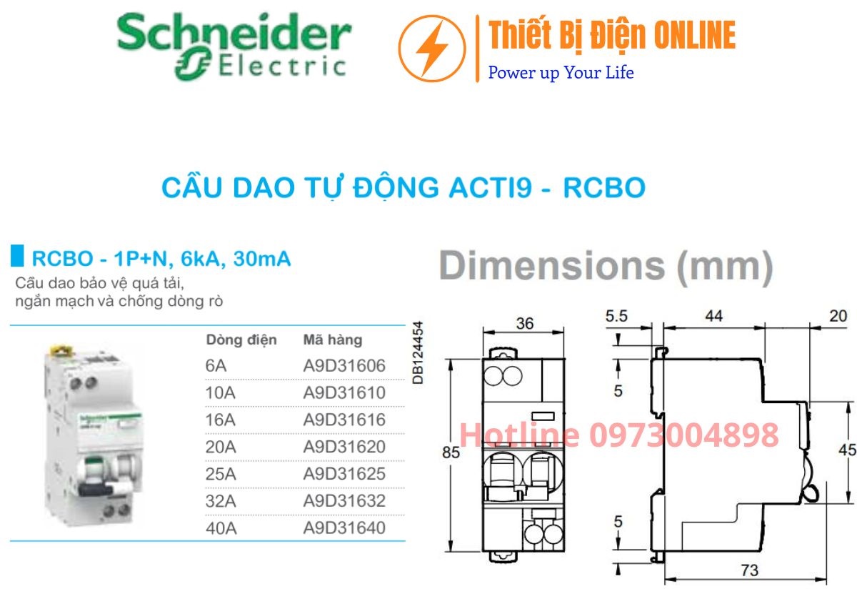 Catalogue Aptomat cầu dao chống giật, chống dòng rò RCBO 1P+N 6A Schneider A9D31616