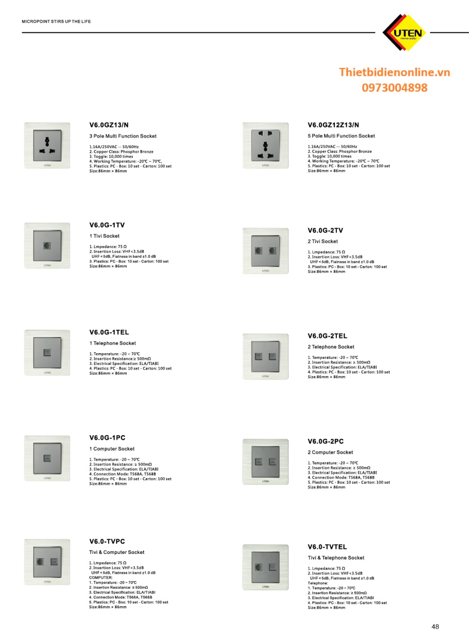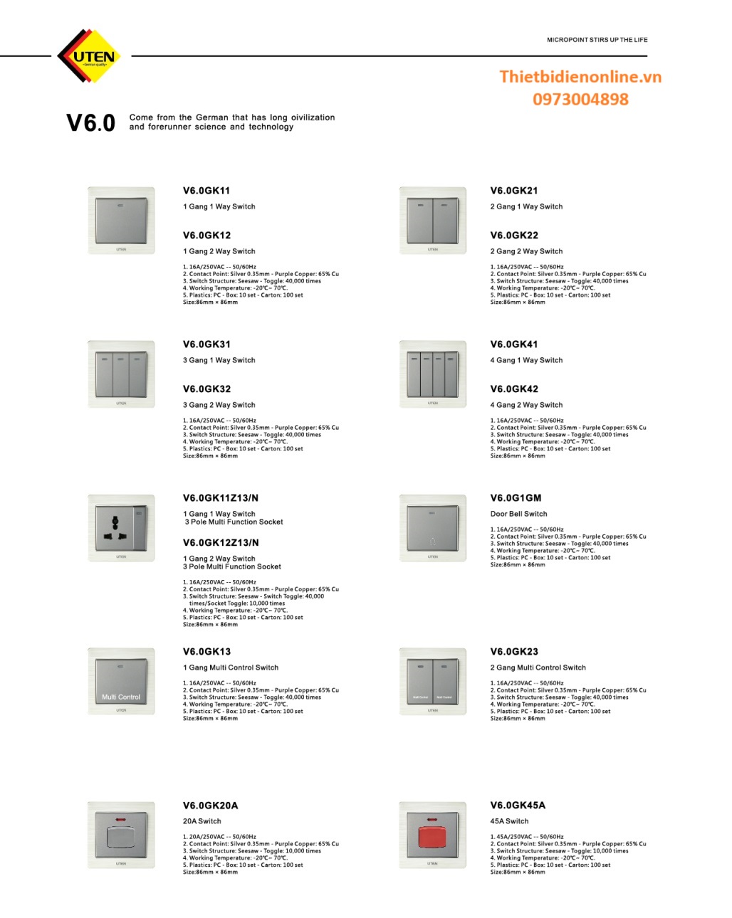 Catalogue Công tắc đơn 2 chiều V6 UTEN V6.0GK12