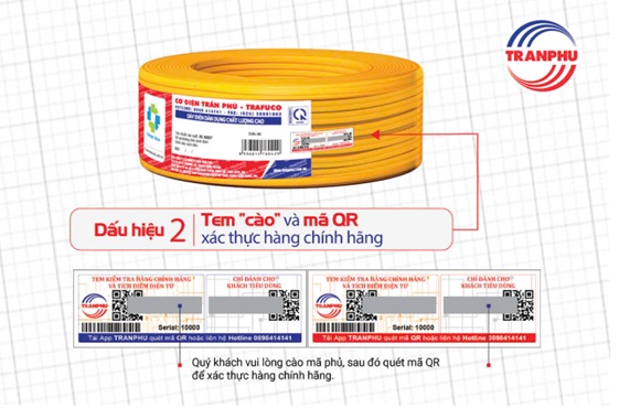 - Trên mỗi cuộn dây điện Trần Phú chính hãng đều có tem chống hàng giả với mã QR. Bạn có thể sử dụng ứng dụng "Trần Phú" để quét mã QR này và xác thực sản phẩm.