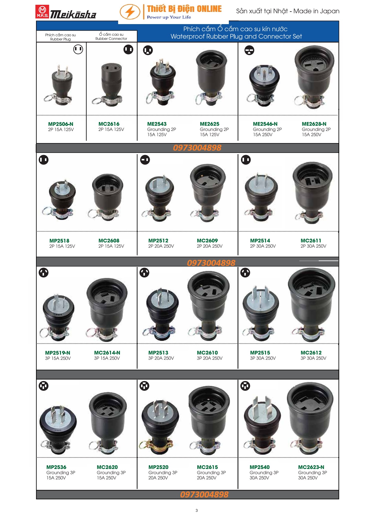 Catalogue MP2514 Meikosha Phích cắm cao su 2P 30A 250V