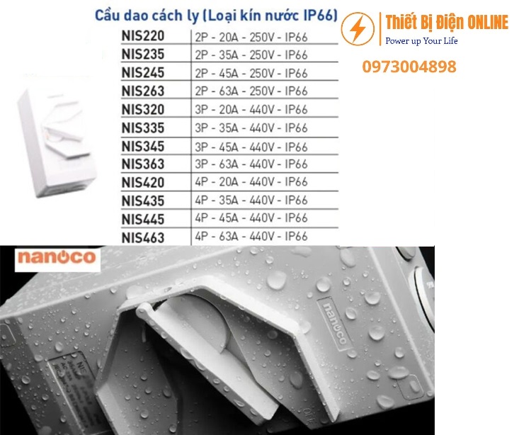 NIS445 Nanoco Isolator 4P-45A IP66 Cầu dao cách ly của Nanoco là thiết bị ngắt mạch an toàn, được sử dụng để cô lập nguồn điện trong hệ thống điện dân dụng và công nghiệp. Dưới đây là thông tin chi tiết về sản phẩm: